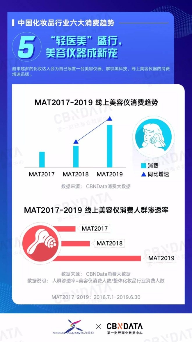 5)護膚品是中國線上美妝行業主要品類,消費占比接近整體的六成;彩妝在2019年加速增長;新興美容儀市場急劇成長;