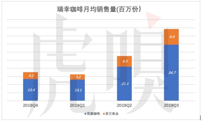 2019年Q3,瑞幸咖啡月均銷售現磨咖啡3470萬杯,輕食等其它食品96萬份。季度總銷量1.33億份,年化銷量5.3億份。
