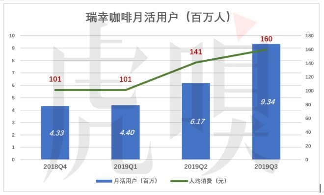 2019年Q3,瑞幸咖啡平均月活用戶達934萬,同比、環比增長分別為746萬和317萬。目前的趨勢,月活用戶的環比增速在加快。2019年Q2、Q3環比增速分別為176萬和317萬。Q1環比增速超低顯然是季節性因素所致。