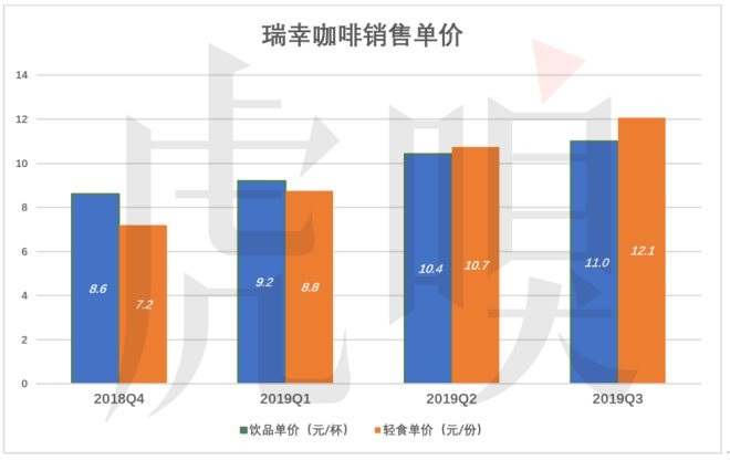 瑞幸咖啡銷售單價正在穩步提升。以現磨咖啡為例,2018年Q4每杯8.6元、2019年Q3每杯11元,提升幅度為28%。