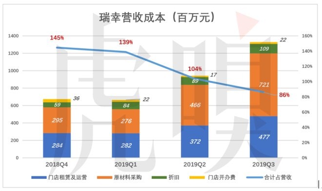 2018年Q1,門店運營成本占營收的156%。2019年前三個季度門店運營成本分別占營收的59%、41%和31%。