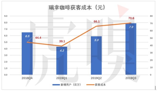門店運營之外,瑞幸咖啡最大的支出是市場費用,2019年Q1、Q2、Q3分別為1.68億、3.9億和5.57億,這三個季度新增用戶數分別為430萬、590萬和790萬。據此算出每獲得一位新用戶的成本是39.1元、66.1元和70.6元。