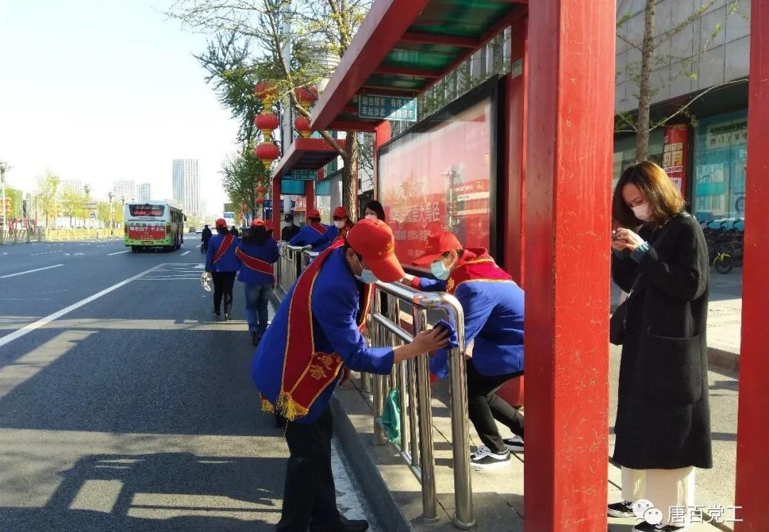 志愿者們清理公交車站周邊雜物、擦拭站臺扶廊。