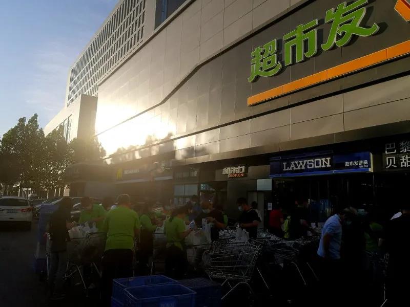 6月15日凌晨5點45,超市發領導班子親自帶領37名志愿者來到超市發玉泉路店,幫忙對運送的一萬余份早餐進行分裝,一直干到早上8點,終于將這一萬多份面包、牛奶、雞蛋、香腸送到了封閉社區居民的手中。