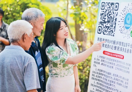 近年來,各地探索運用數(shù)字技術(shù)創(chuàng)新監(jiān)督手段,提升監(jiān)督的針對性和效果。圖為2024年9月14日,貴州省黔西市紀(jì)檢監(jiān)察干部在錦繡街道錦繡社區(qū)指導(dǎo)群眾利用微信小程序等進(jìn)行舉報監(jiān)督。 人民圖片 周訓(xùn)超/攝